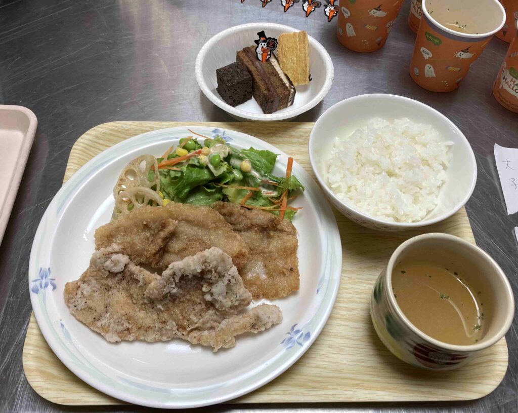 秋本番の10月12日(日)、第7回キッチン・わーぐるを開催しました。今回のメインディッシュは「雅とん」特製の豚の唐揚げ。当日、ふじアリーナで開催されていた「第7回こども食堂応援カップ」のフードドライブで頂いた蓮根を急遽素揚げにして、彩り野菜サラダを添えました。また、ハロウィンシーズンということで、ご寄贈頂いたチョコブラウニーやケーキにパイ菓子を添え、ハロウィン・チョココンビデザートを作りました。