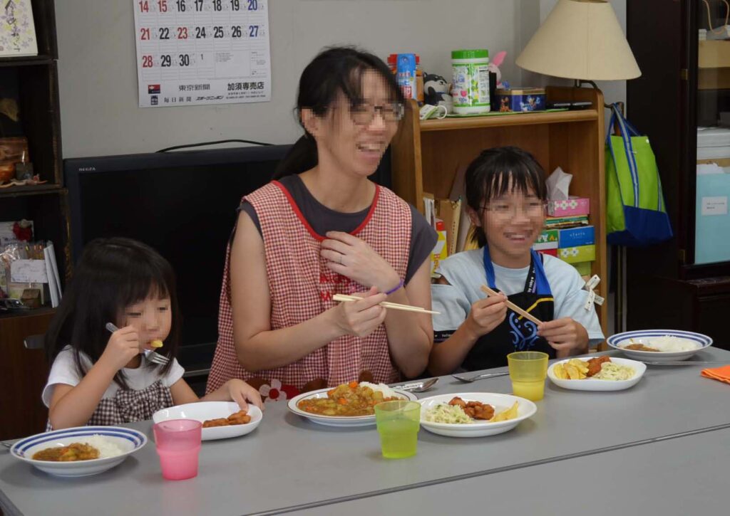 けて、スタッフも含めてみんなそろって「いただきます」。自分で作ったカレーはおいしかっ