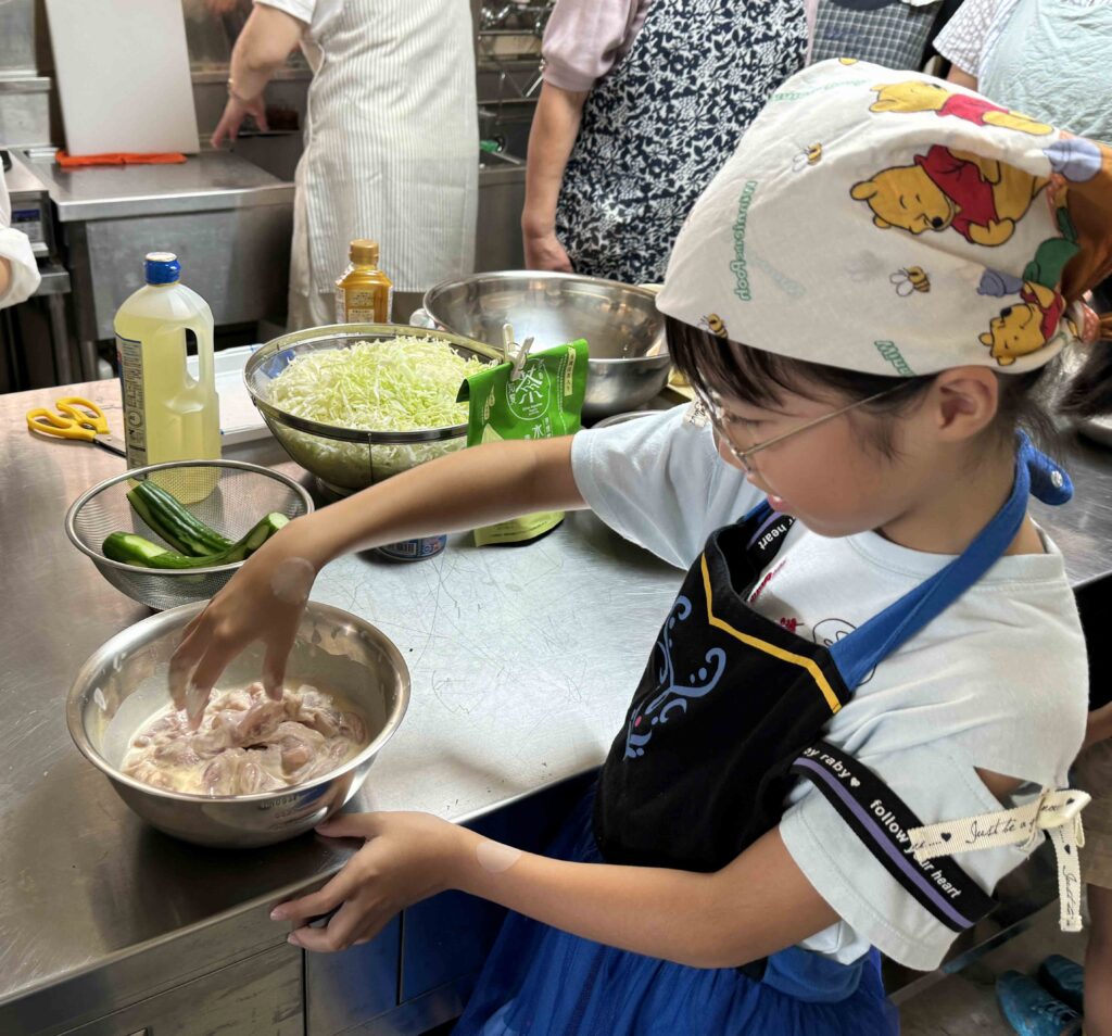 粉にとり肉を入れてもみこんだり、梨の皮をむいたりなど、自分たちでできる作業をそれぞれ